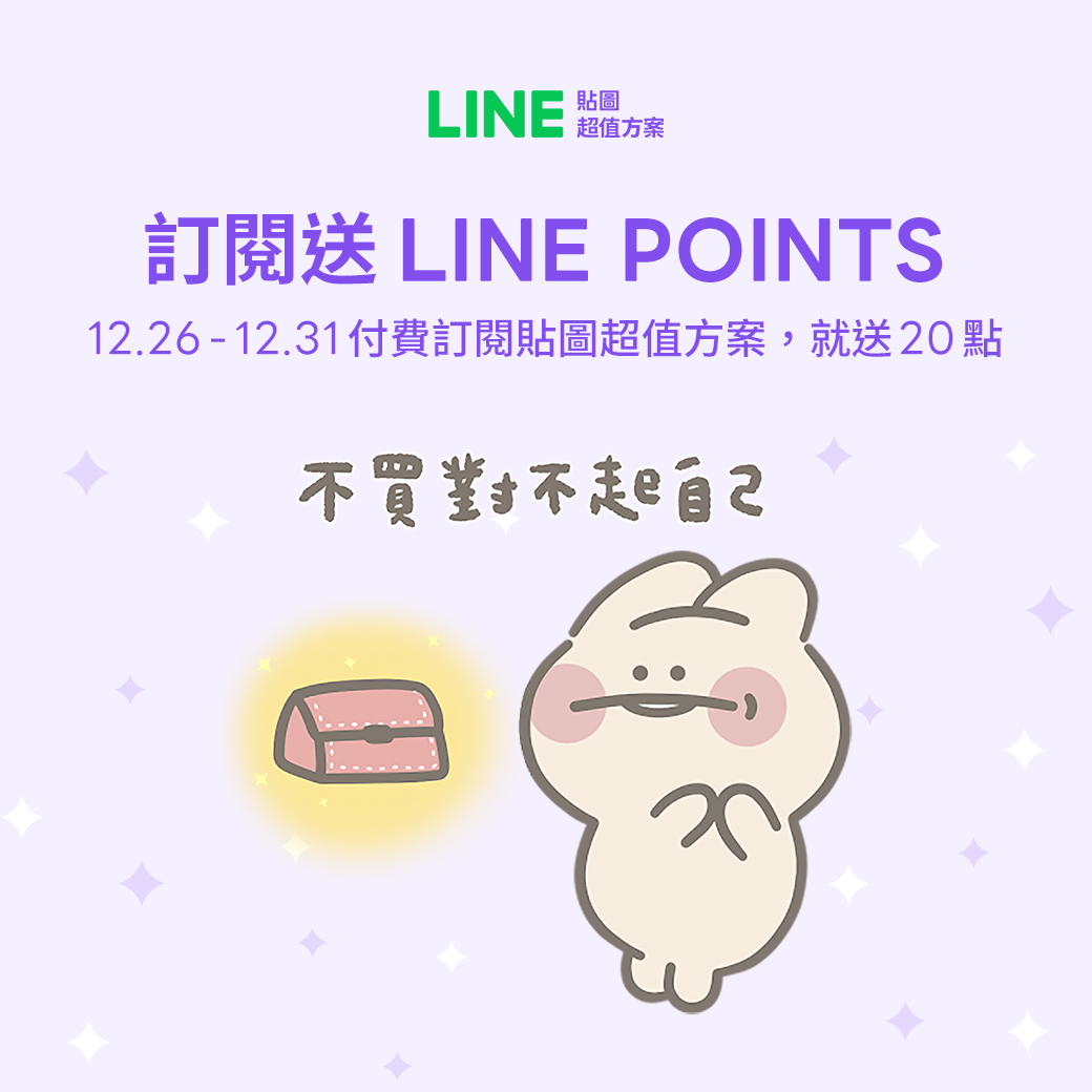 凡在本活動期間內,付費訂閱或付費續約LINE貼圖超值方案之用戶,並需同時滿足以下兩個條件即可獲得本活動獎項LINE POINTS 20點(本活動獎項LINE POINTS非即時發送,將於2023年2月28日前發放),本活動將以付費訂閱的時間順序為發點順序,本活動獎項總共限量LINE POINTS 75,000點,額滿為止,將不另行通知。