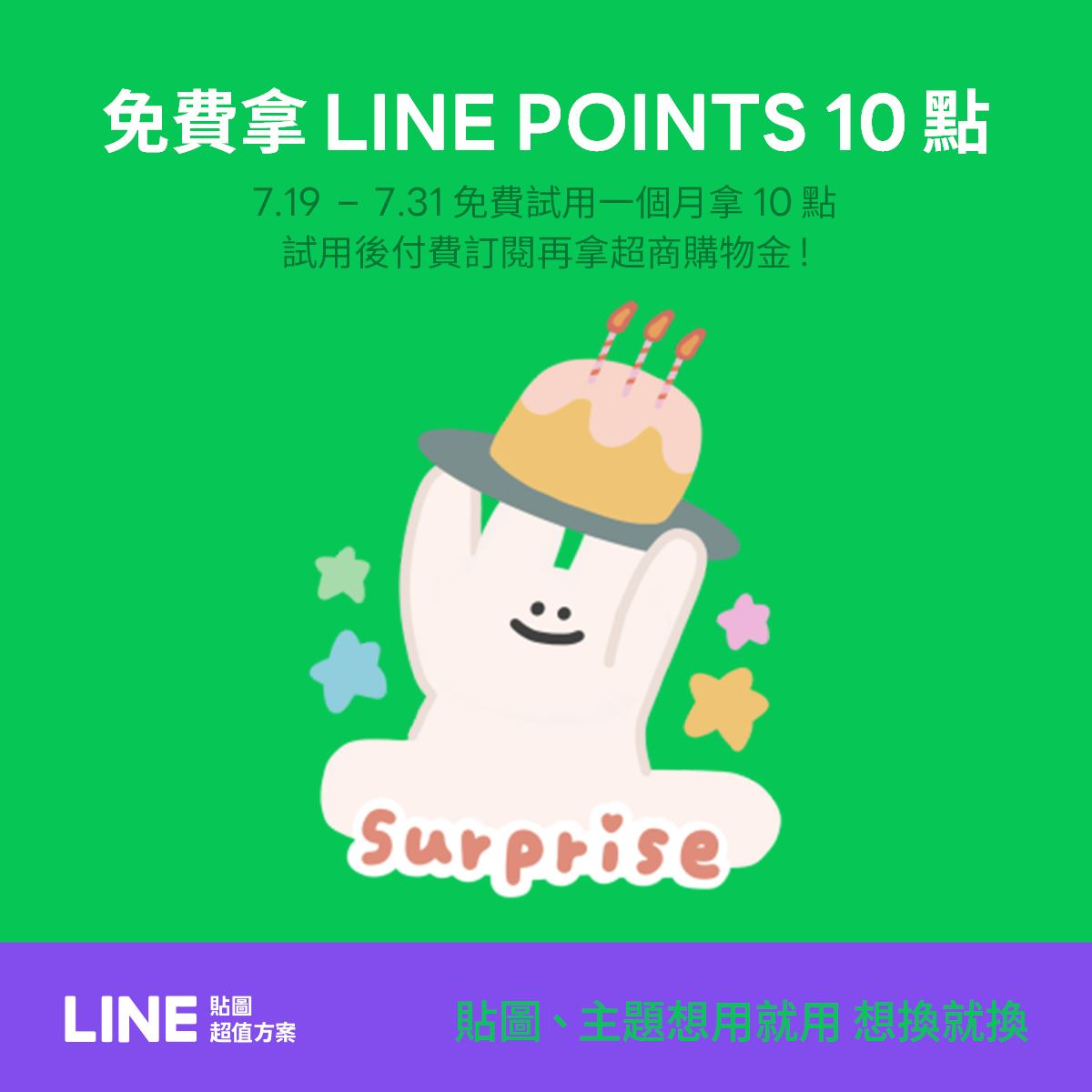 *若您在7月19日 00:00 至 7月31日 22:59間訂閱LINE貼圖超值方案時,按鈕為「免費體驗一個月」且付款金額顯示0元或免費者即符合獲贈LINE POINTS 10點之資格。