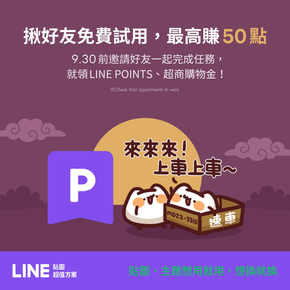 *被分享者若在9月21日 12:00 至 9月30日 23:59間訂閱LINE貼圖超值方案時,按鈕為「免費體驗一個月」且付款金額顯示0元或免費者,即符合免費試用之條件。若被分享者成功免費試用,分享者具獲贈LINE POINTS 5點之資格,被分享者則具獲贈四大超商4選一20元購物金之資格。