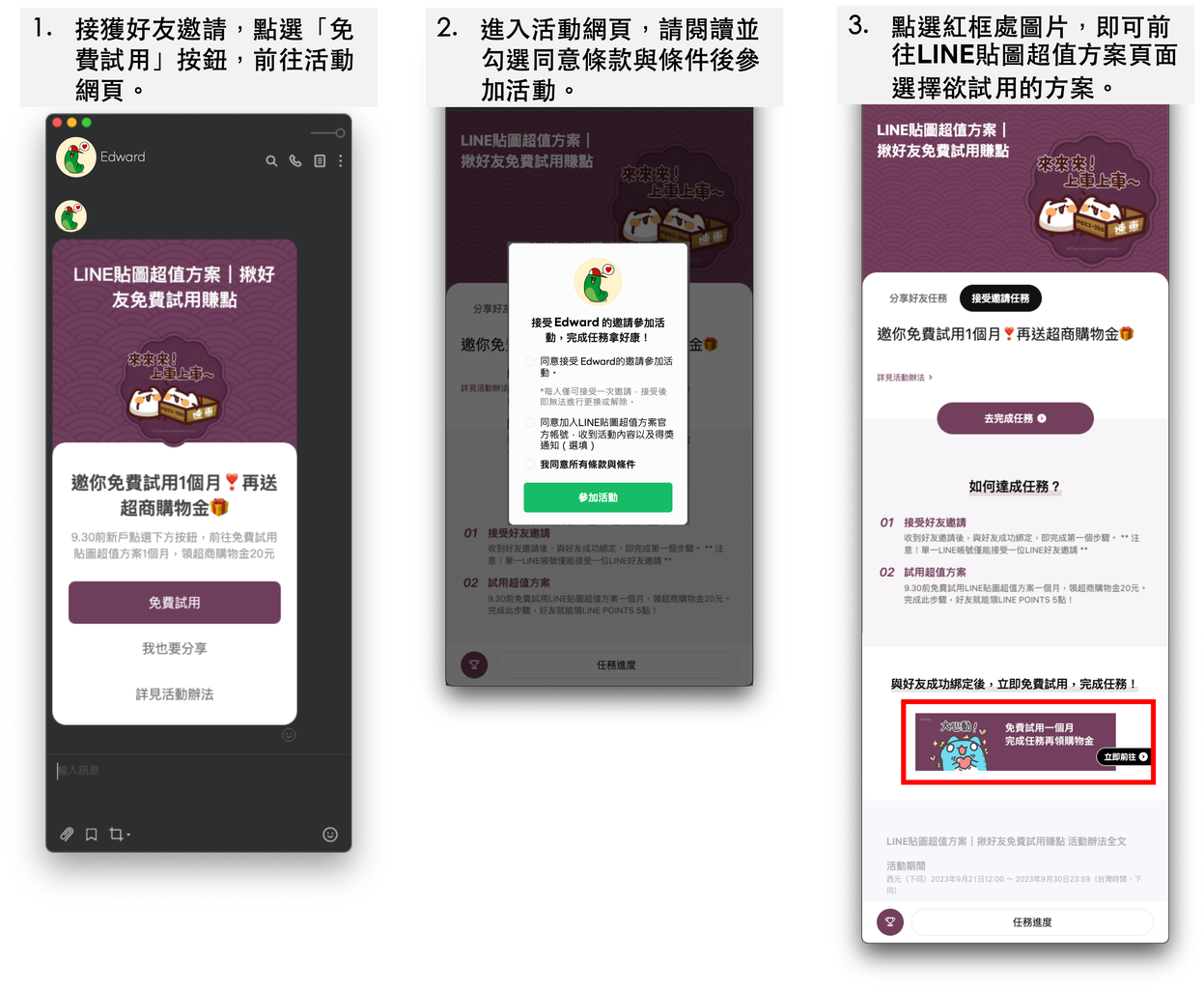 5. 此活動期間為2023年9月21日 12:00~2023年9月30日 23:59,分享者請在此活動期間內完成分享,被分享者請於此活動期間內完成免費試用LINE貼圖超值方案。逾期未完成分享者或未完成免費試用LINE貼圖超值方案者,視同放棄並自動取消資格。
