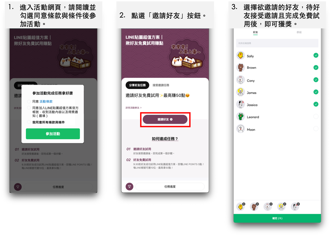 凡在本活動期間內,每成功邀請一位好友免費試用LINE貼圖超值方案者(下稱「分享者」),即可獲得LINE POINTS 5點獎項一次;成功邀請兩位好友者,總共可獲得LINE POINTS 10點,以此類推,於本活動單一LINE帳號最多可獲得10次獎項,亦即最多可獲得LINE POINTS 50點。本活動獎項之LINE POINTS 5點限量9,600名。