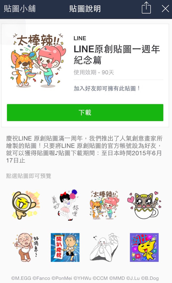 紀念篇中集結了目前台灣原創貼圖人氣插畫家,包含「米滷蛋」、「賤女奈奈」」、「椪妹柯基」、「GoGoCat果貓貓」、「台客阿公」、「台客阿祥」、「崩潰先生」、「Bigdog大狗小貓隨手畫」的1週年限定貼圖!請各位務必下載這款超珍貴的貼圖喔!!