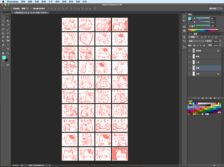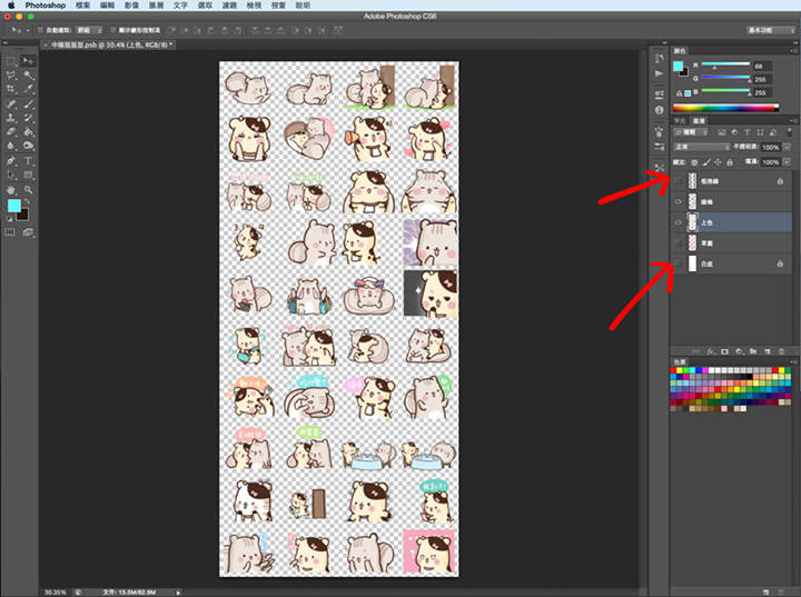 關閉之後,我們在上色圖層中迅速地將40張貼圖上色!