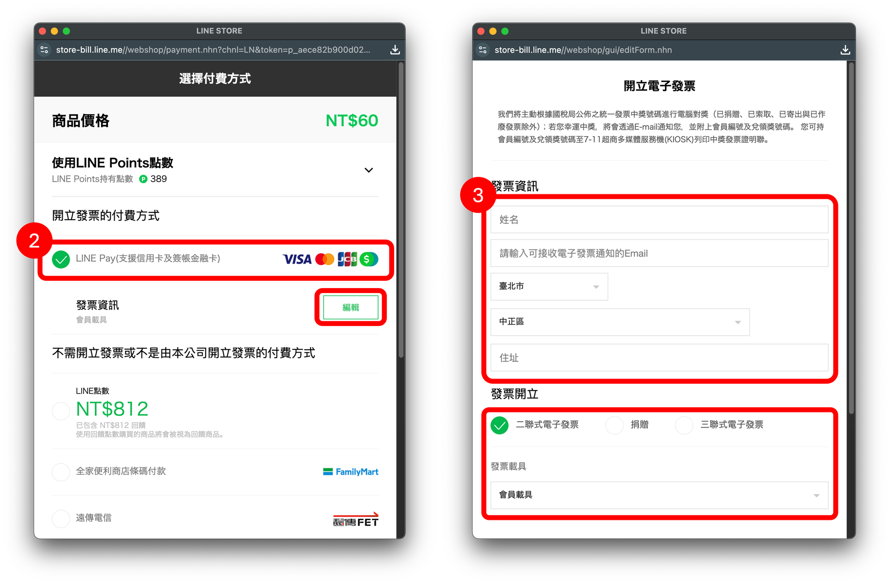 步驟 3:選好付款方式後,畫面會跳出發票資訊,請務必填寫。
