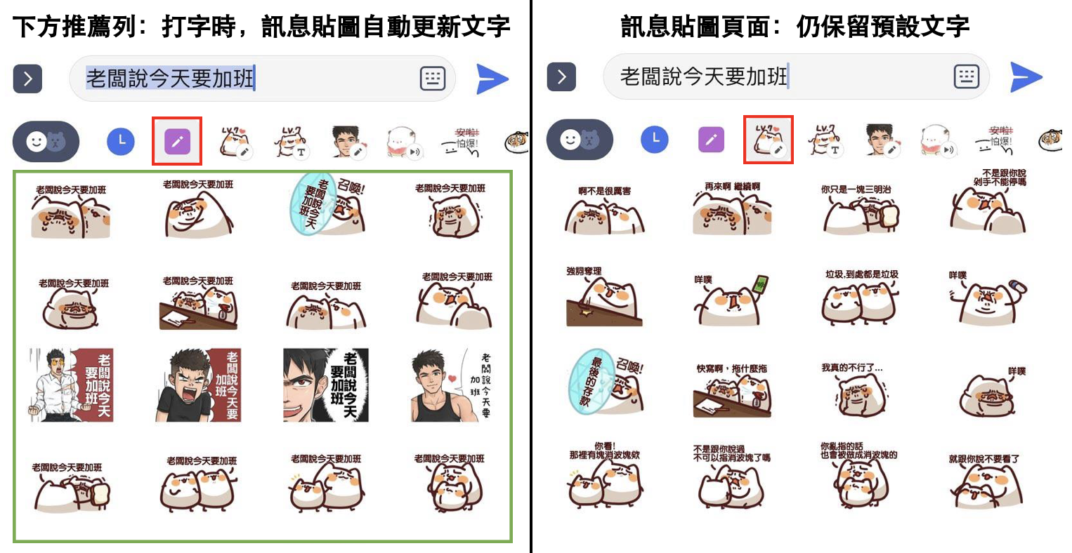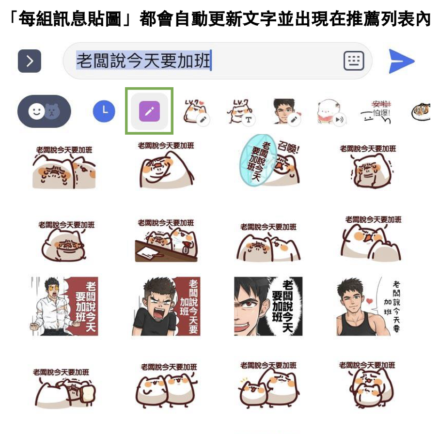 1. 訊息貼圖內的文字,只會在「打完字」並點選「鉛筆按鈕」時,於下方推薦列表「暫時」套用文字。貼圖傳送後,訊息貼圖仍保留預設文字!